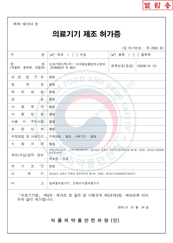 허가증_신고증 License of Medical Device Manufacturing_2018.07.24