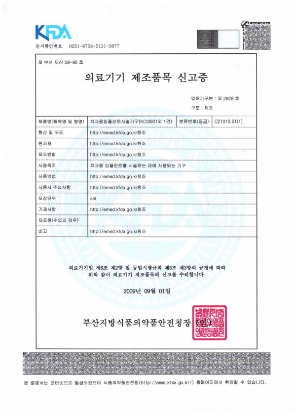 - 다음글의료기기제조품목신고증(치과용임플란트 시술용기구)_2009.08.05 23.10.20
