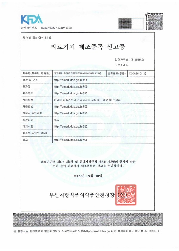 허가증_신고증 의료기기제조품목신고증(치과용임플란트 가공재료)_2009.09.10 페이지 정보 작성자 신세기메디텍 댓글 0건 조회 25회 작성일 23-10-20 11:23 목록 본문 1 이전글의료기기제조허가증_2016.01.12 23.10.20 다음글의료기기제조품목신고증(치과용임플란트 시술용스크류드라이버)_2009.08.04 23.10.20 댓글 0 댓글목록 등록된 댓글이 없습니다.